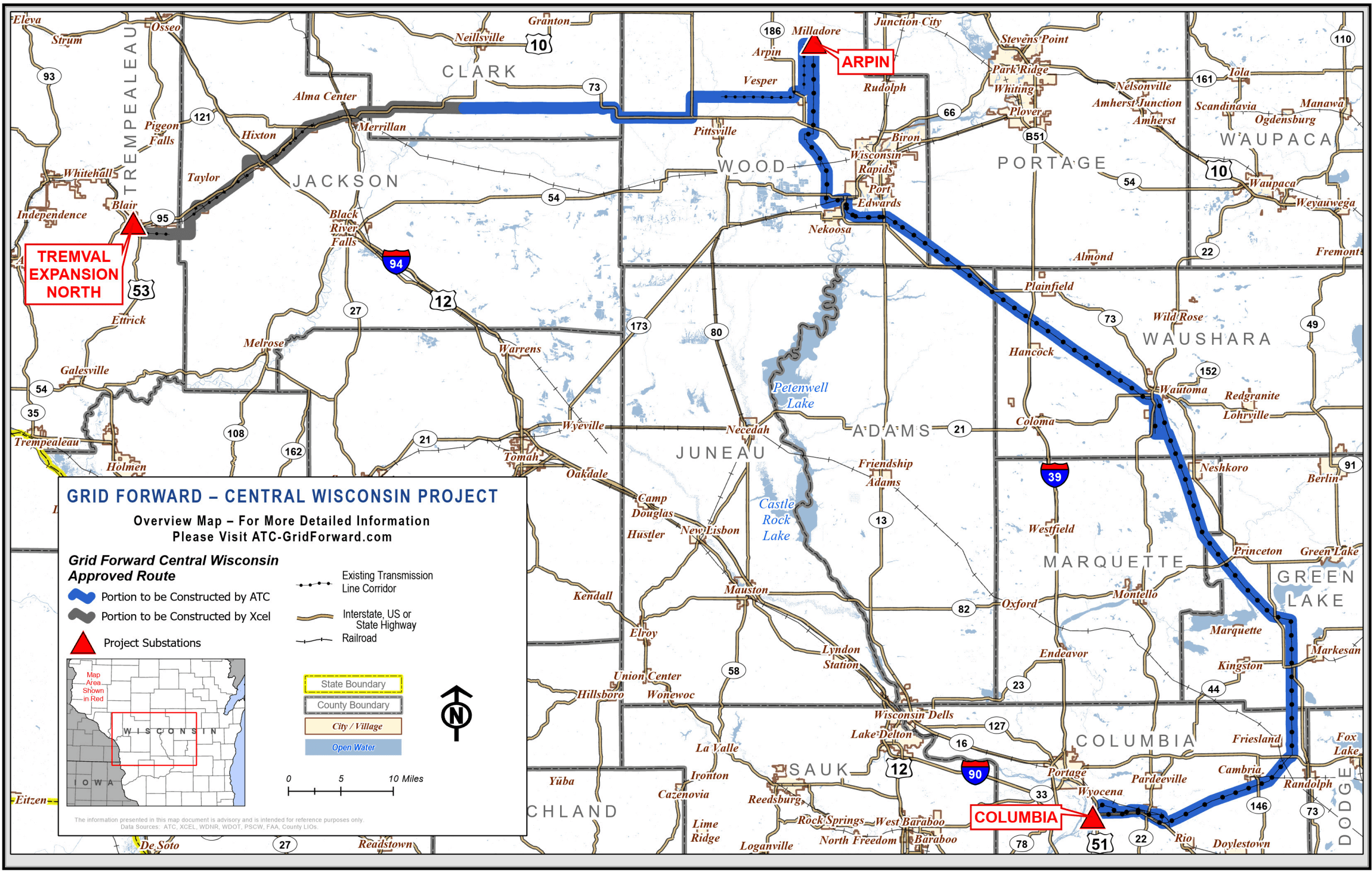 The Public Service Commission of Wisconsin (PSCW) approved the Grid Forward Central Wisconsin project in December 2025. In collaboration with Xcel Energy, the approved route will connect the Columbia Substation in Columbia County, the Arpin Substation in Wood County and the Tremval Substation in Trempealeau County.